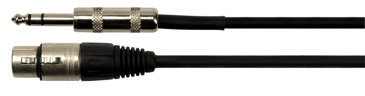 Sort kabel med XLR-hun i metall og strekkavlastning i gummi. Balansert jackkontakt i metall og strekkavlastning i gummi. 1m